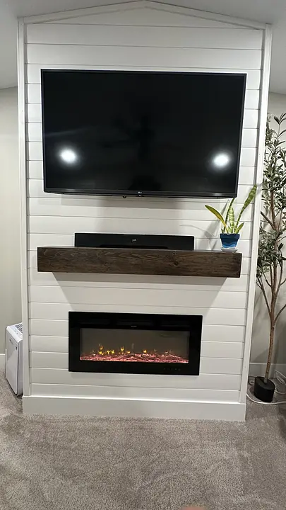 Custom solid wood floating shelf/mantel. Built to add warmth and character to any living room or fireplace setup.